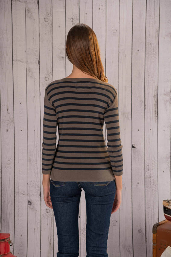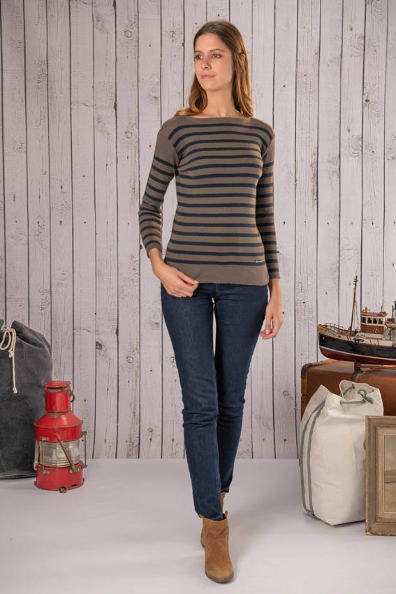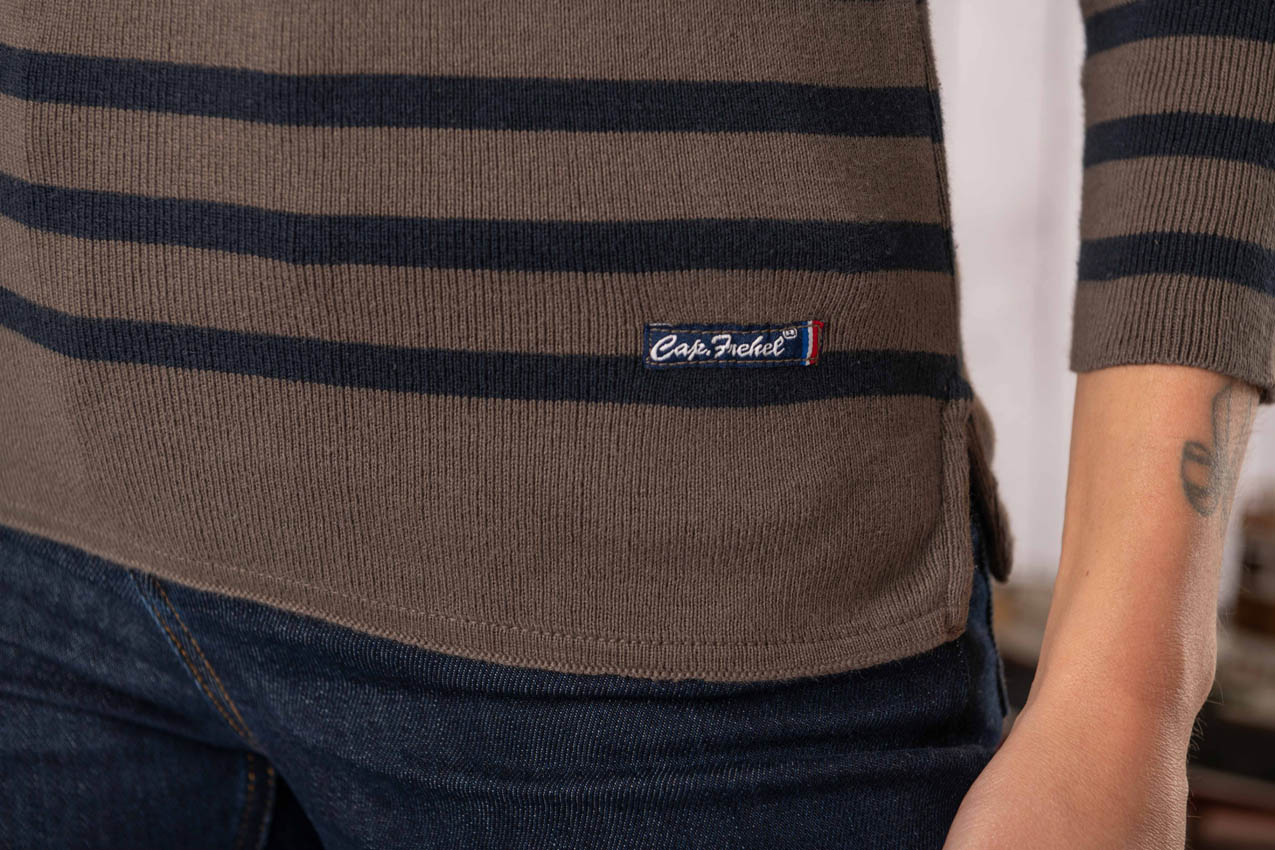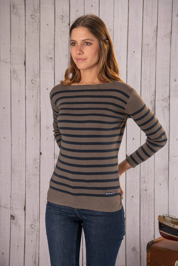 En hommage aux Midships (terme désignant les élèves officiers du vaisseau la Jeanne d’Arc). Tricotée à partir de fil 100% coton bio. Reconnaissable à partir de son véritable col bateau croisé et de ses 21 rayures.